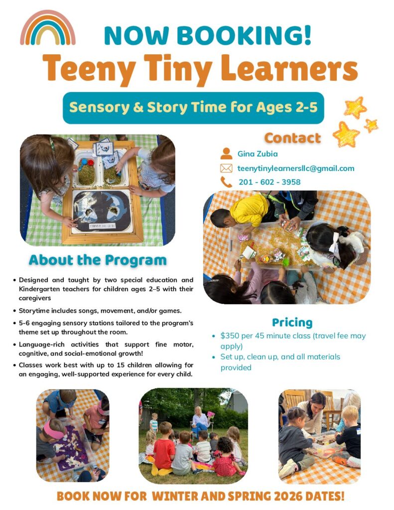 Teeny Tiny Learners LLC was created to provide families with an inclusive, stimulating environment that allows their toddler to engage in sensory exploration and development, while learning to build a sense of community for both parent and child. This sensory and story time experience is designed especially for little ones ages 2–5.